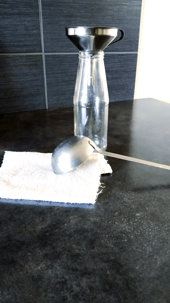 L’idéal est d’utiliser une ancienne bouteille de lessive, avec une poignée, pratique à utiliser. Pensez bien à y mettre une étiquette avec LESSIVE DE CENDRES.